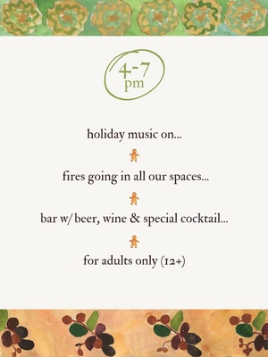 We'll have our fires going in the parlor & dining rooms, holiday music on, beer, wine and a special cocktail available at the bar. The restaurant will be closed this evening.